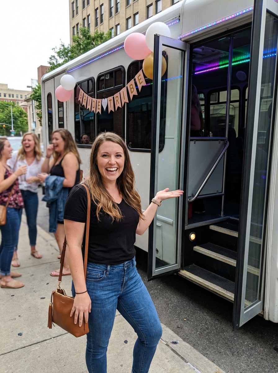 model with bachelorette party bus, party on wheels, bride tribe ready to celebrate, excited poses