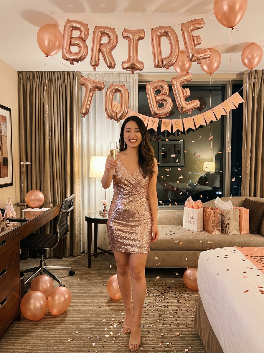 model with bachelorette party decorations, rose gold balloons, champagne toast, glamorous outfit, celebration vibe