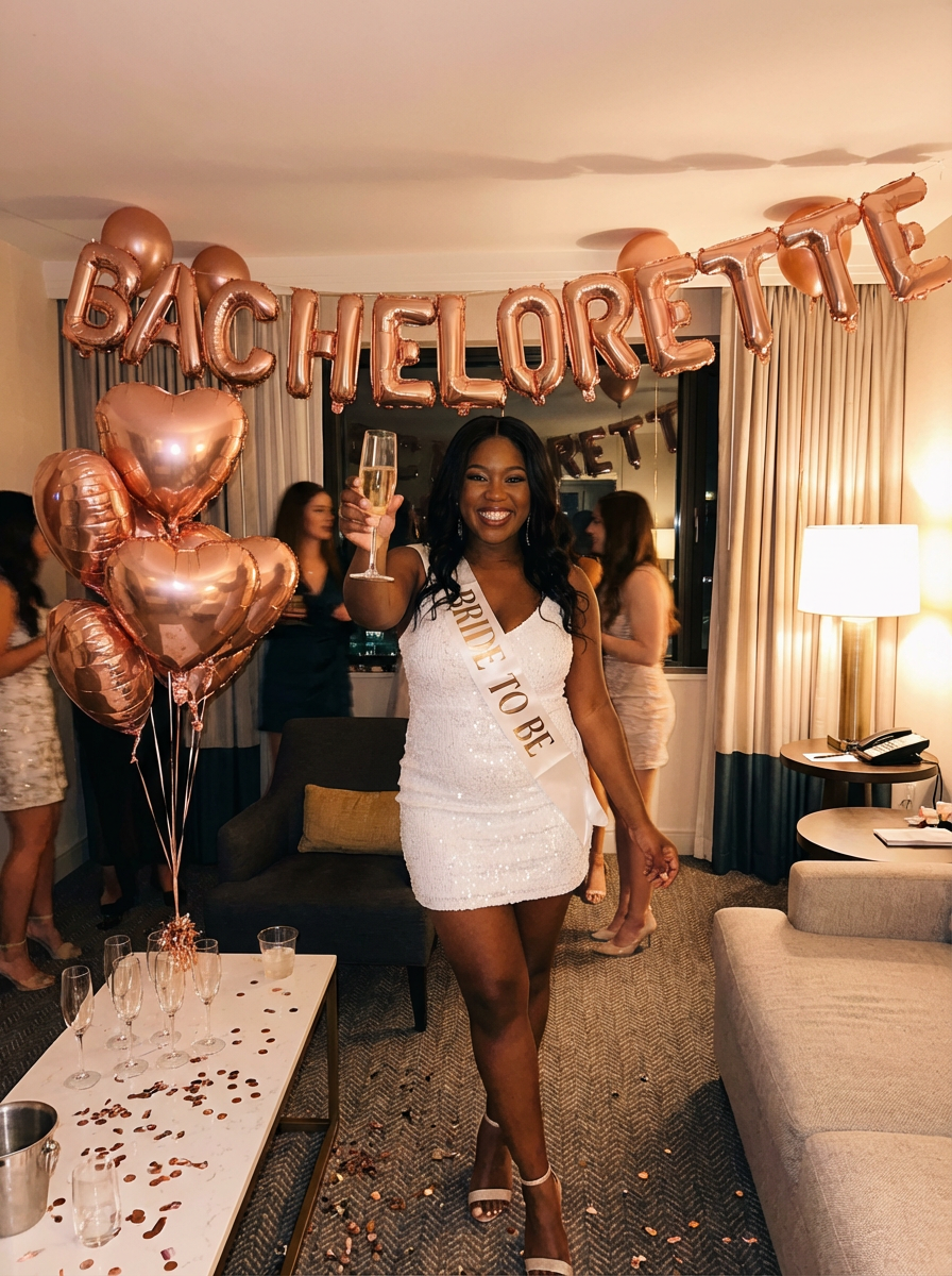 model with bachelorette party decorations, rose gold balloons, champagne toast, glamorous outfit, celebration vibe