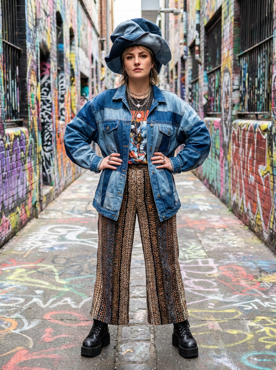 model with bold fashion choice, confident in unique style, artistic urban setting