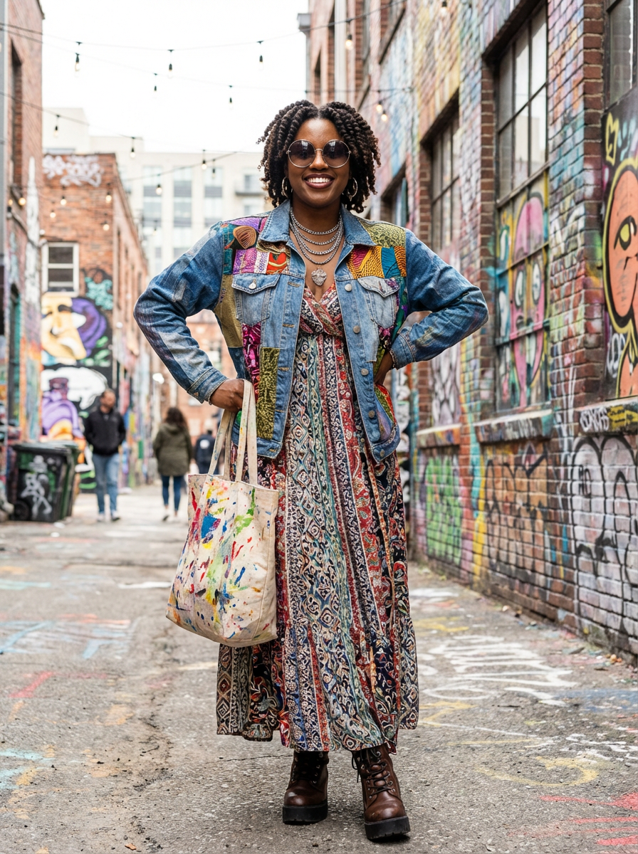 model with bold fashion choice, confident in unique style, artistic urban setting