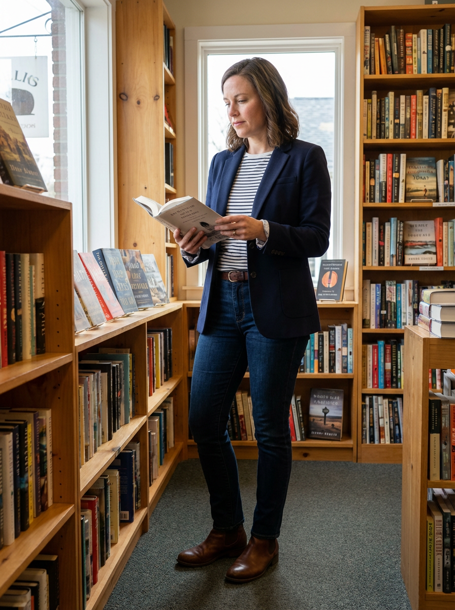 model with books or in bookstore, thoughtful expression, casual smart outfit, cozy atmosphere