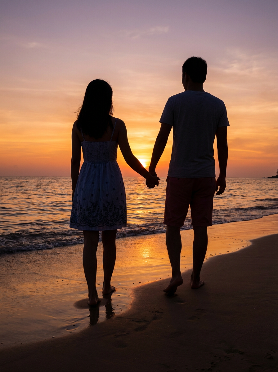 model with boyfriend at sunset beach, romantic silhouette, walking along shoreline, casual summer clothes, golden hour