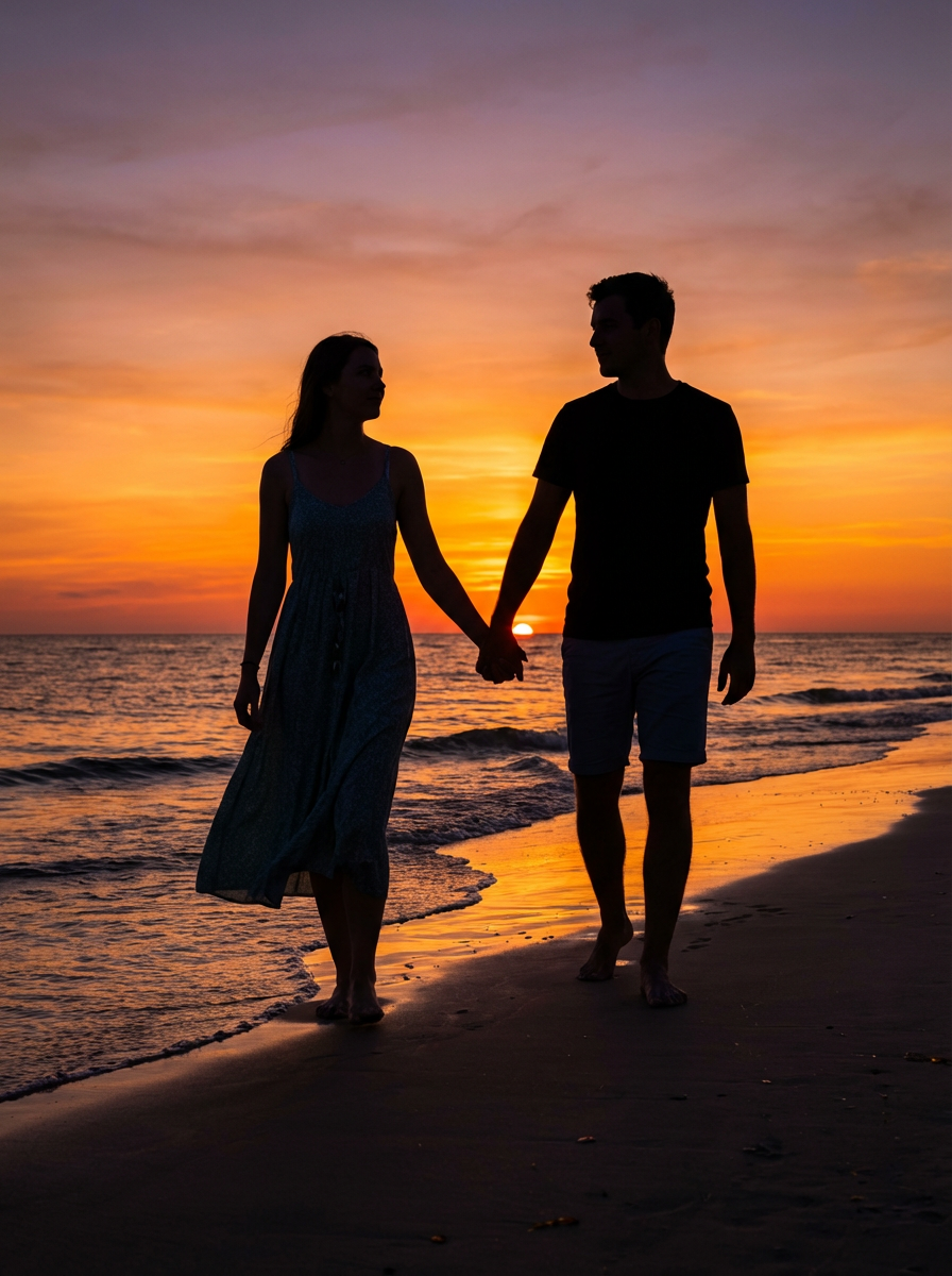 model with boyfriend at sunset beach, romantic silhouette, walking along shoreline, casual summer clothes, golden hour