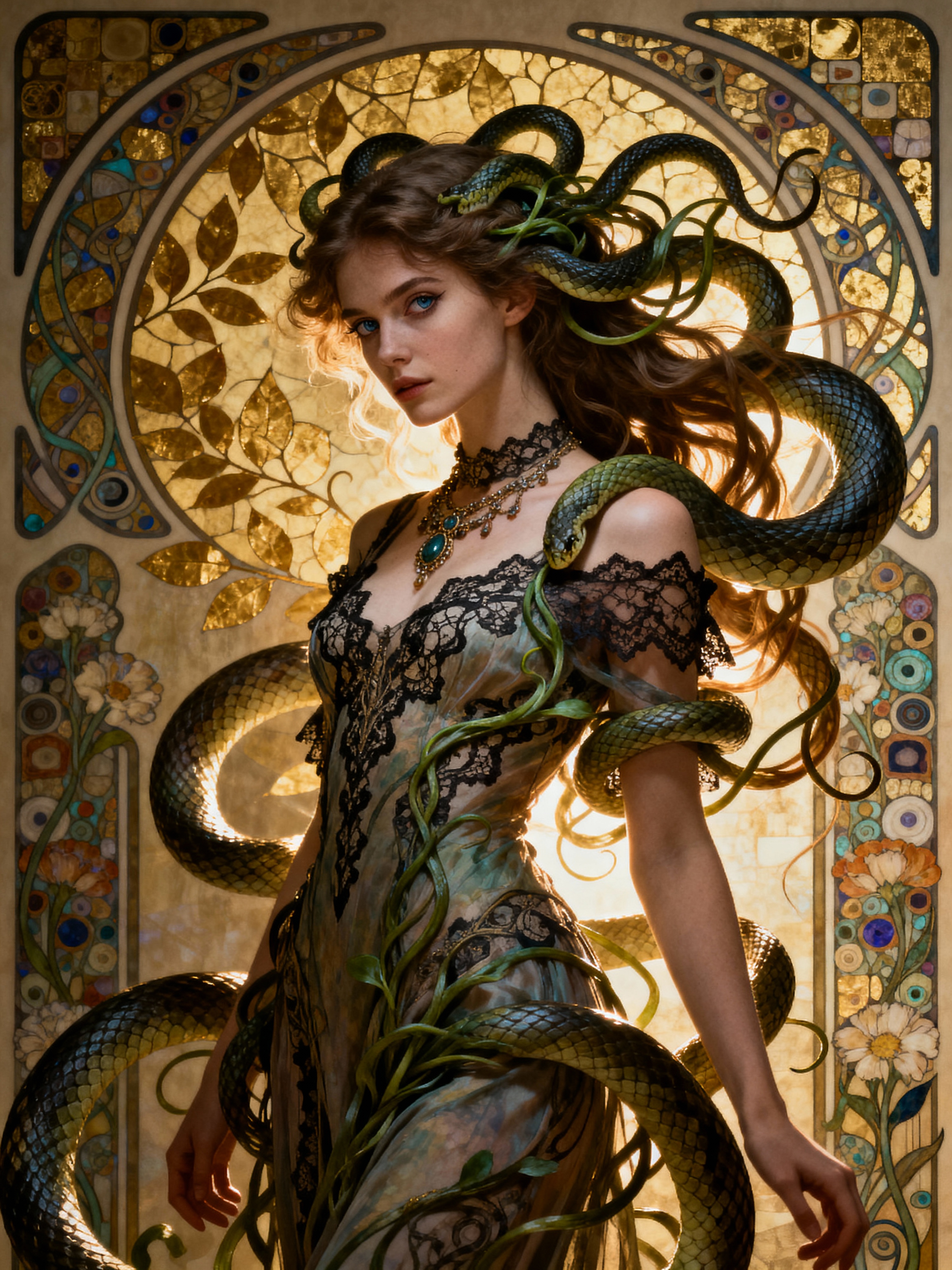 model with coiled serpents beautiful detailed romantic art nouveau by alphonse mucha, kay nielsen, yoshitaka amano, and gustav klimt, hauntingly beautiful refined moody dreamscape