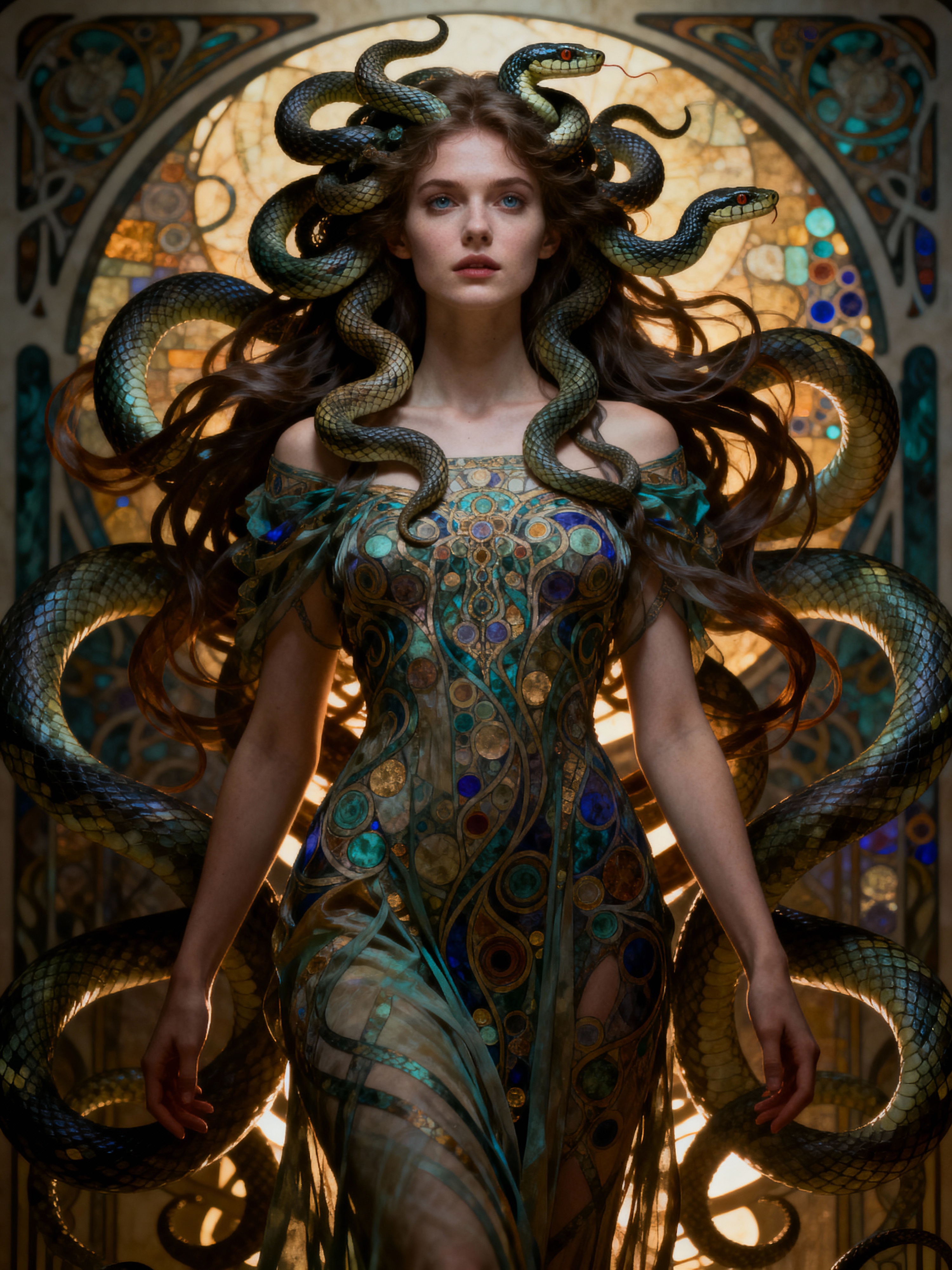 model with coiled serpents beautiful detailed romantic art nouveau by alphonse mucha, kay nielsen, yoshitaka amano, and gustav klimt, hauntingly beautiful refined moody dreamscape
