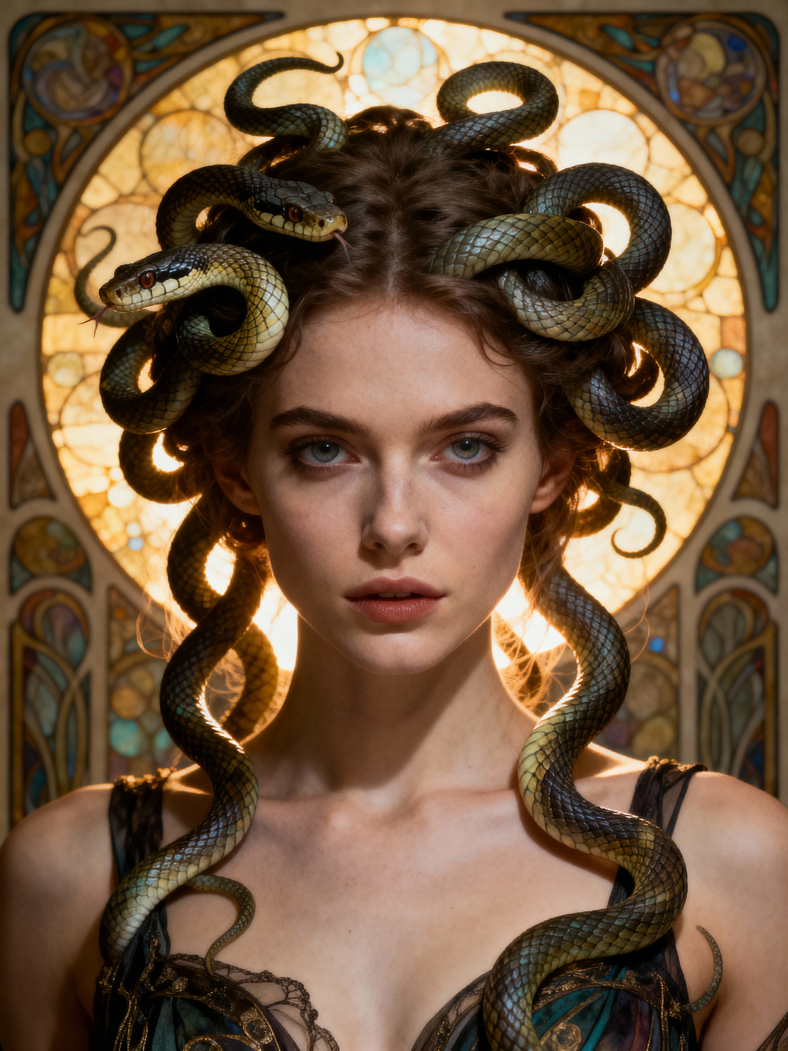 model with coiled serpents beautiful detailed romantic art nouveau by alphonse mucha, kay nielsen, yoshitaka amano, and gustav klimt, hauntingly beautiful refined moody dreamscape