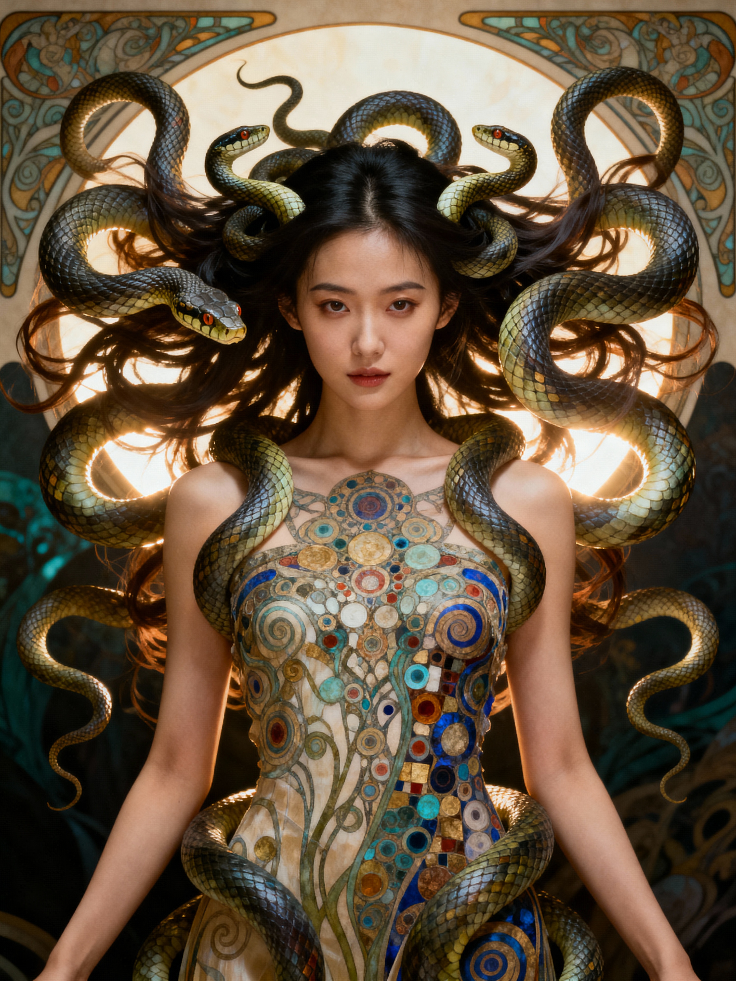 model with coiled serpents beautiful detailed romantic art nouveau by alphonse mucha, kay nielsen, yoshitaka amano, and gustav klimt, hauntingly beautiful refined moody dreamscape