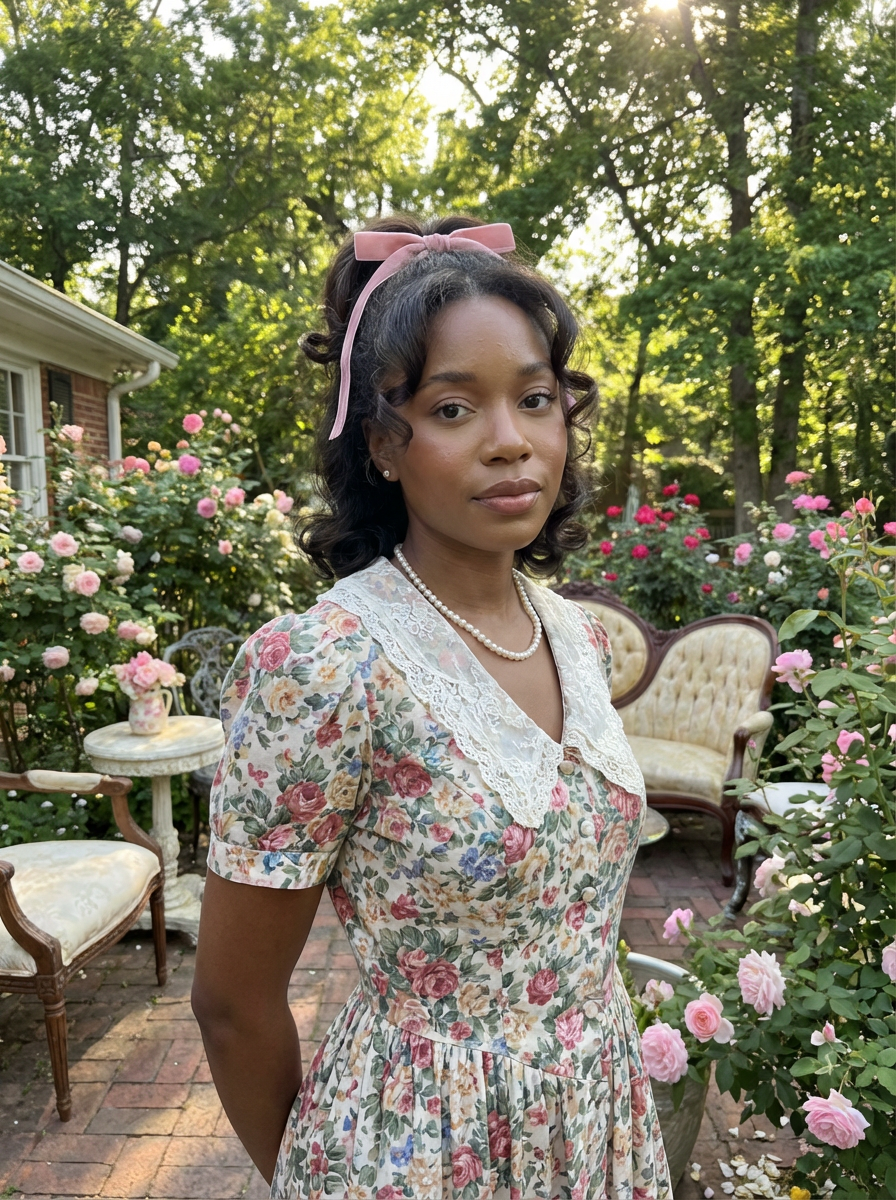 model with coquette hair, half up with ribbon, soft curls, delicate makeup, feminine portrait