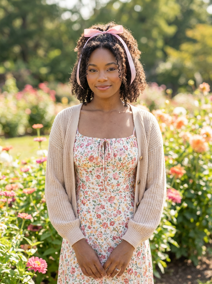 model with coquette hair, half up with ribbon, soft curls, delicate makeup, feminine portrait