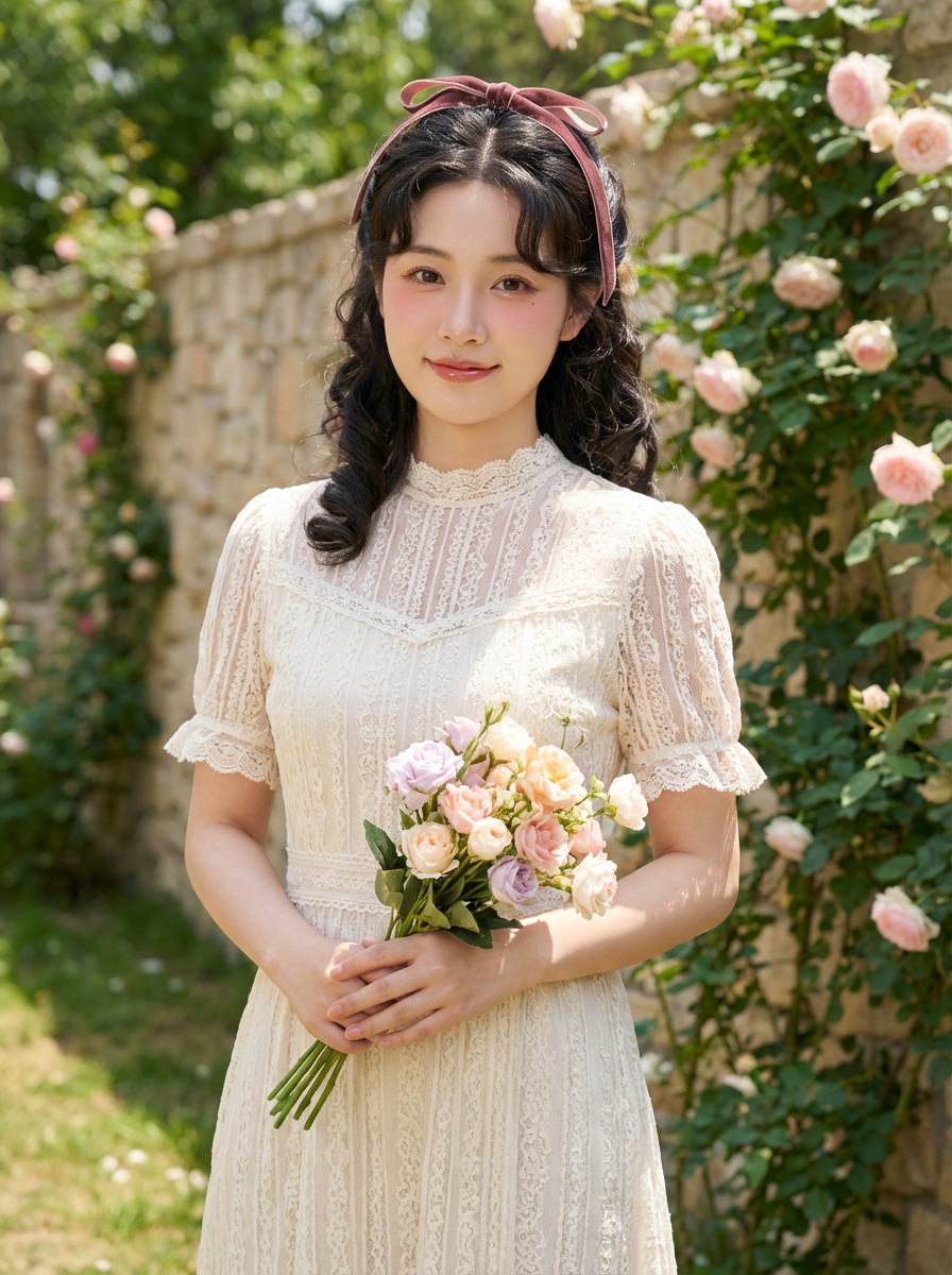 model with coquette makeup, rosy cheeks, glossy lips, doe eyes, ribbon in hair, romantic vintage background