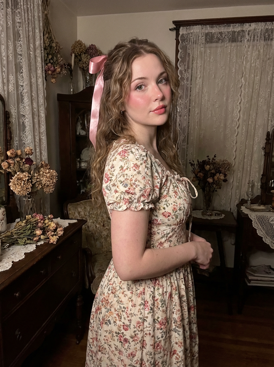 model with coquette makeup, rosy cheeks, glossy lips, doe eyes, ribbon in hair, romantic vintage background