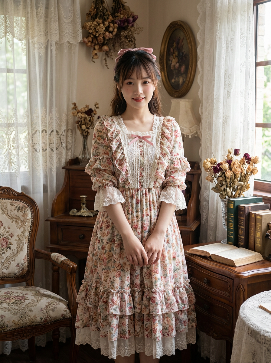 model with coquette makeup, rosy cheeks, glossy lips, doe eyes, ribbon in hair, romantic vintage background