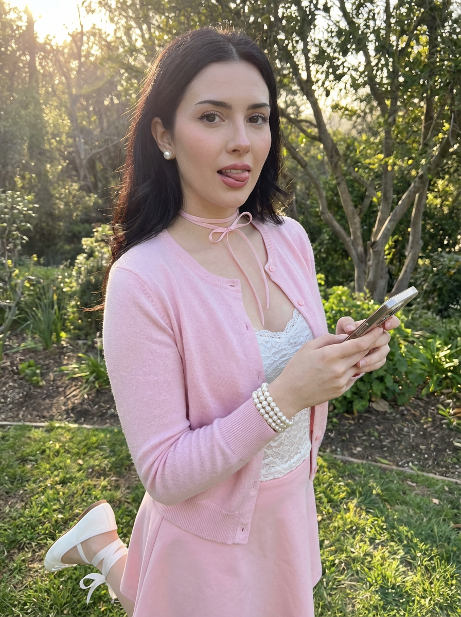 model with coquette style, pearl jewelry, ballet flats, ribbon choker , pastel pink outfit
