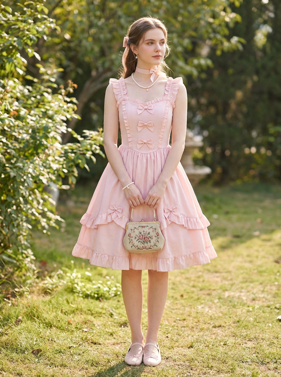 model with coquette style, pearl jewelry, ballet flats, ribbon choker , pastel pink outfit