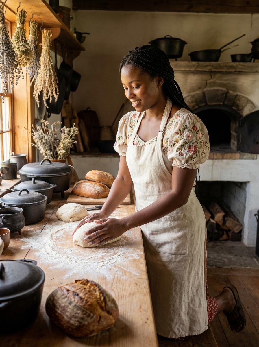 model with cottagecore aesthetic, linen apron, puff sleeve blouse , baking bread in rustic kitchen