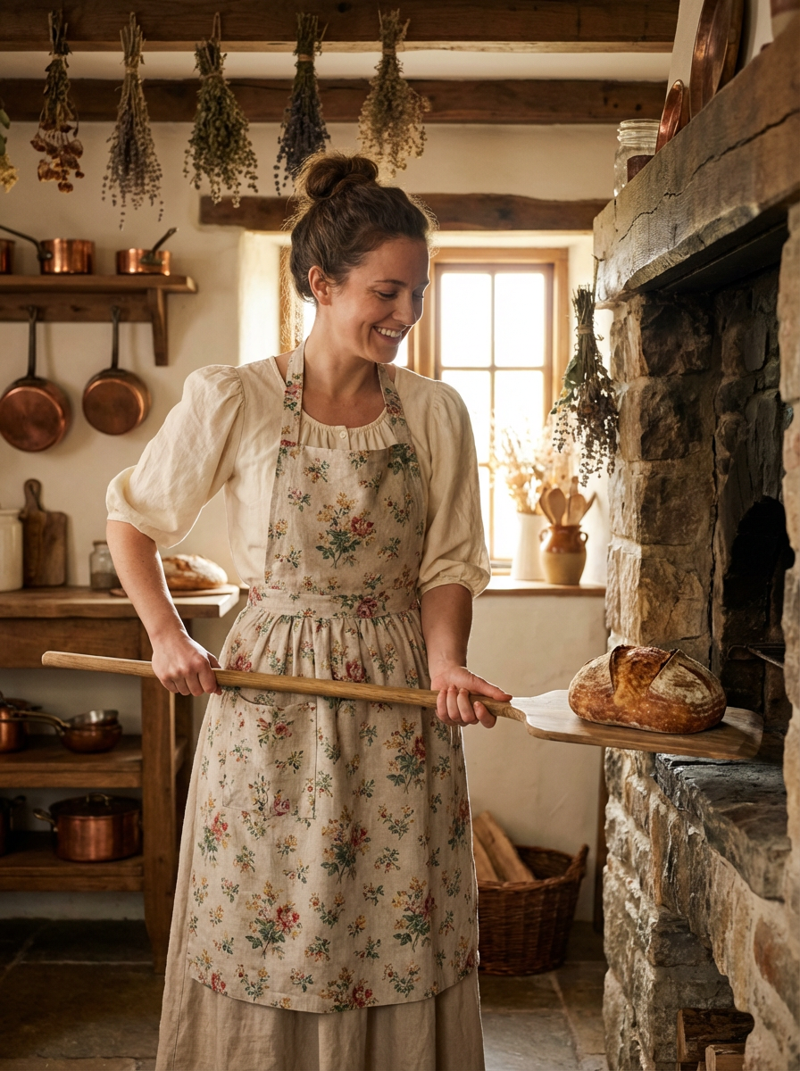 model with cottagecore aesthetic, linen apron, puff sleeve blouse , baking bread in rustic kitchen