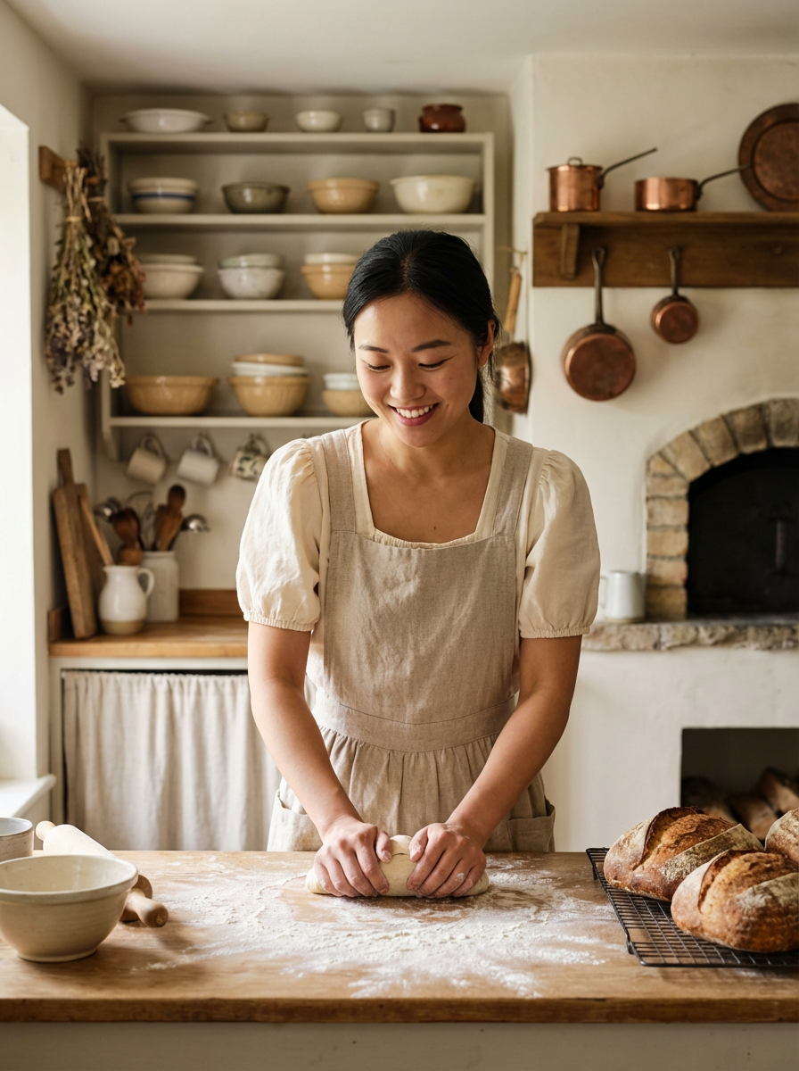 model with cottagecore aesthetic, linen apron, puff sleeve blouse , baking bread in rustic kitchen