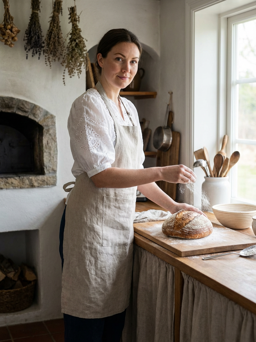 model with cottagecore aesthetic, linen apron, puff sleeve blouse , baking bread in rustic kitchen
