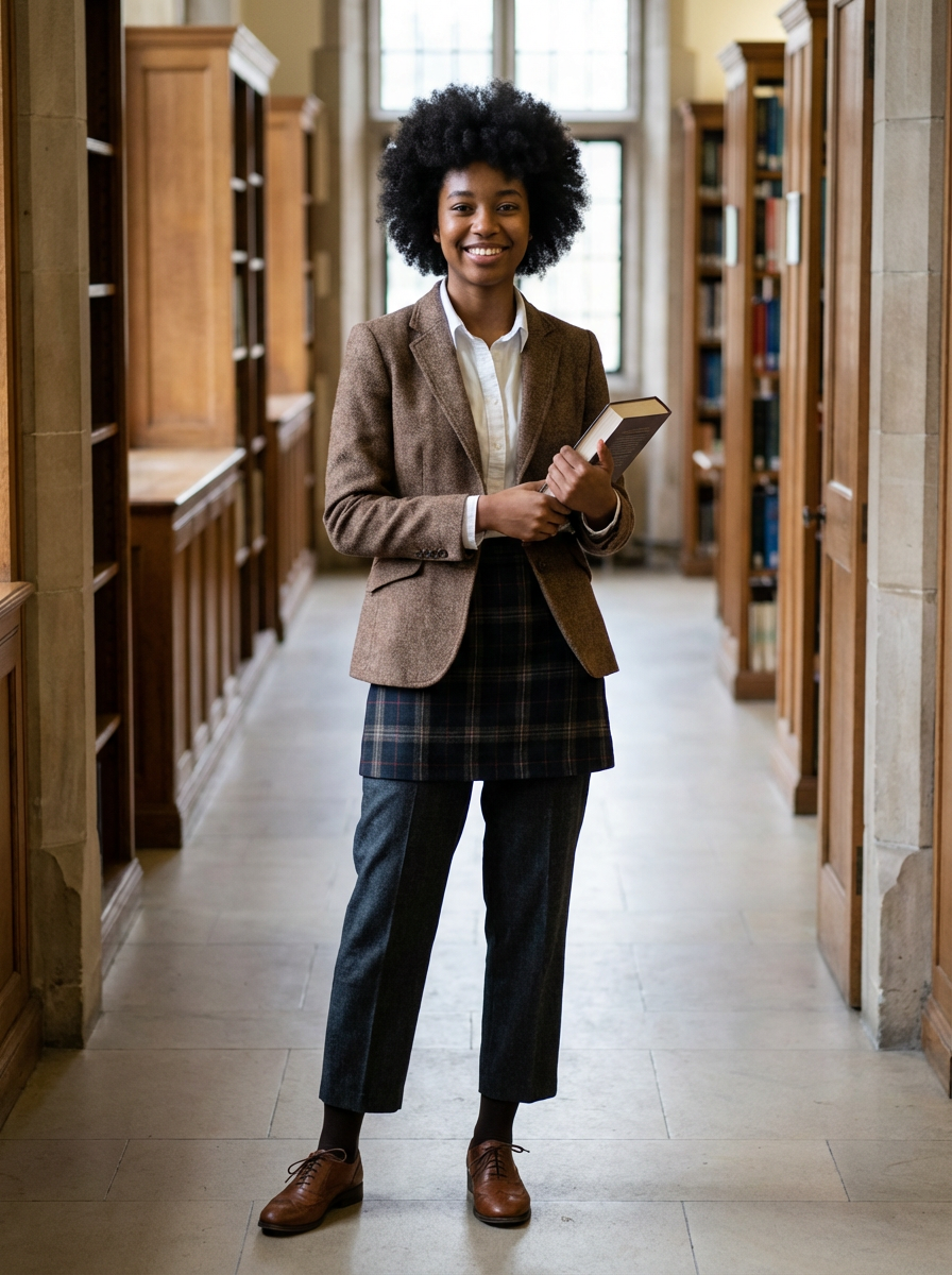 model with dark academia style, oxford shoes, pleated trousers, plaid skirt , university corridor setting