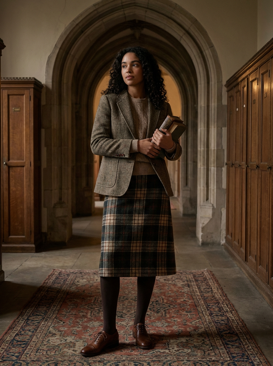 model with dark academia style, oxford shoes, pleated trousers, plaid skirt , university corridor setting