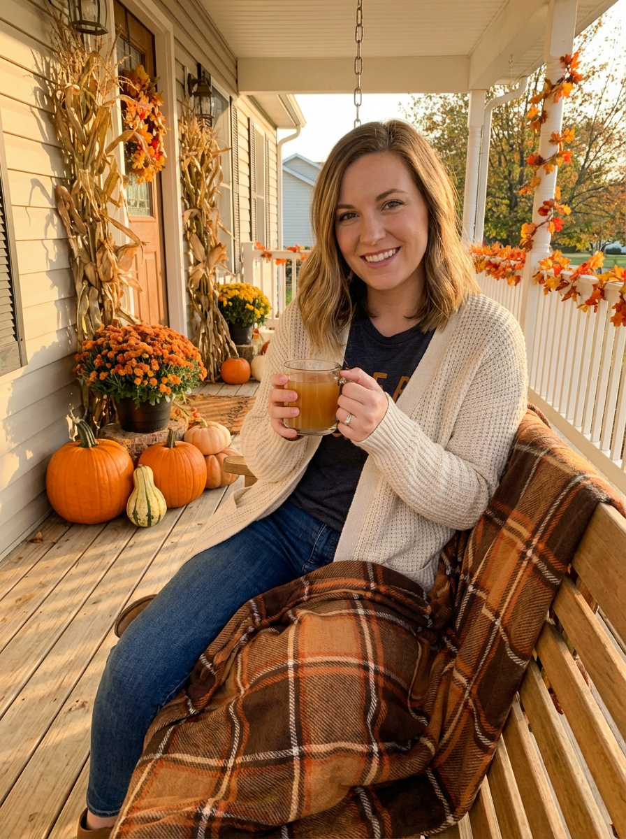 model with hot apple cider, cozy porch setting, fall decorations, wrapped in blanket, autumn afternoon
