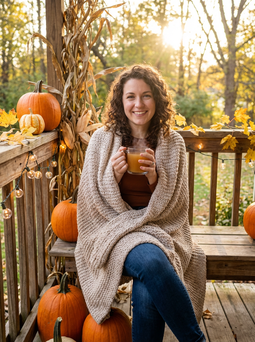 model with hot apple cider, cozy porch setting, fall decorations, wrapped in blanket, autumn afternoon