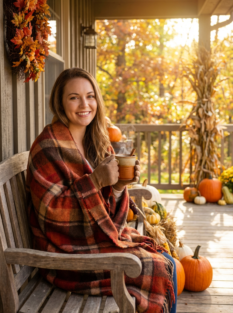 model with hot apple cider, cozy porch setting, fall decorations, wrapped in blanket, autumn afternoon
