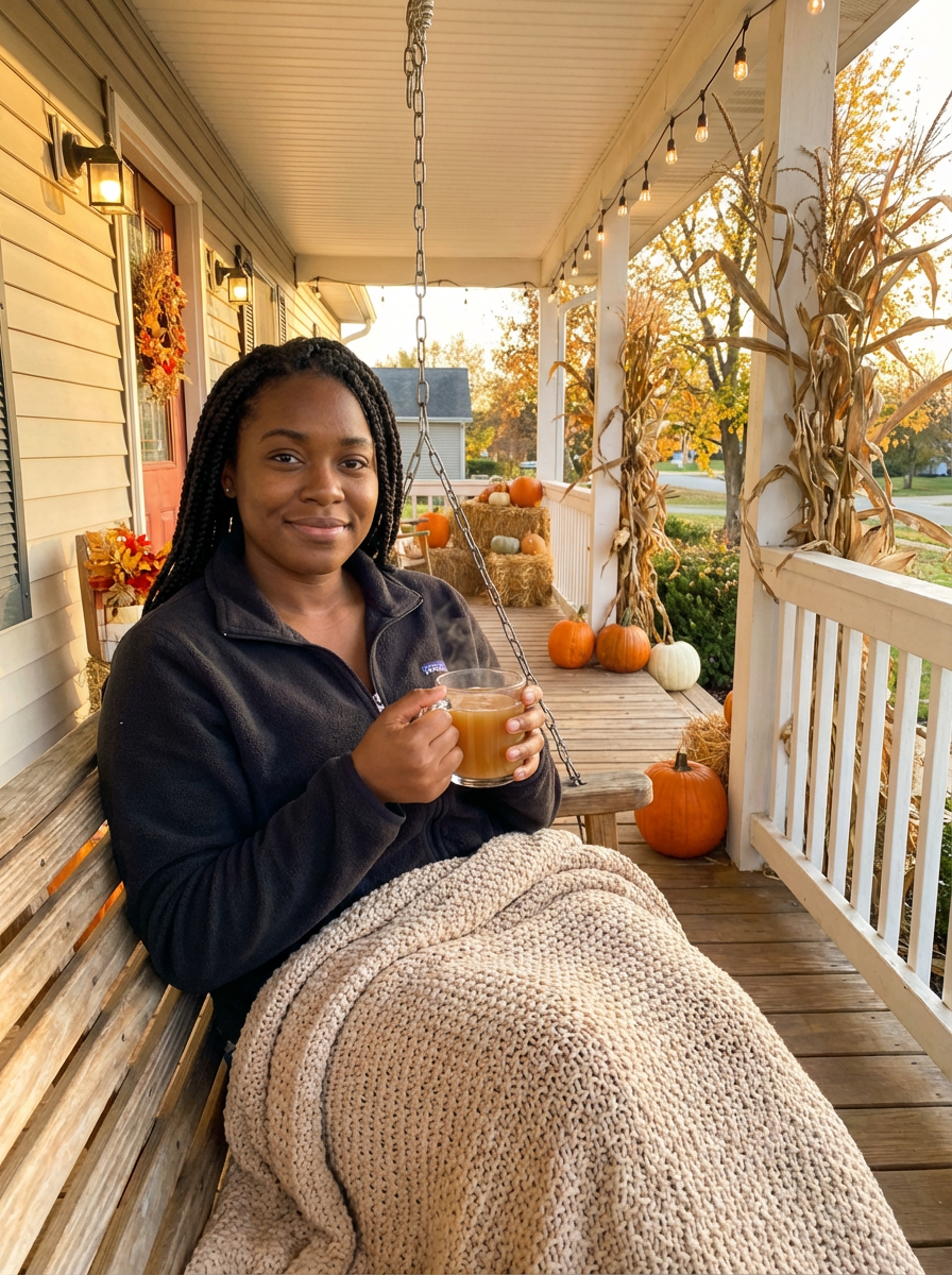 model with hot apple cider, cozy porch setting, fall decorations, wrapped in blanket, autumn afternoon
