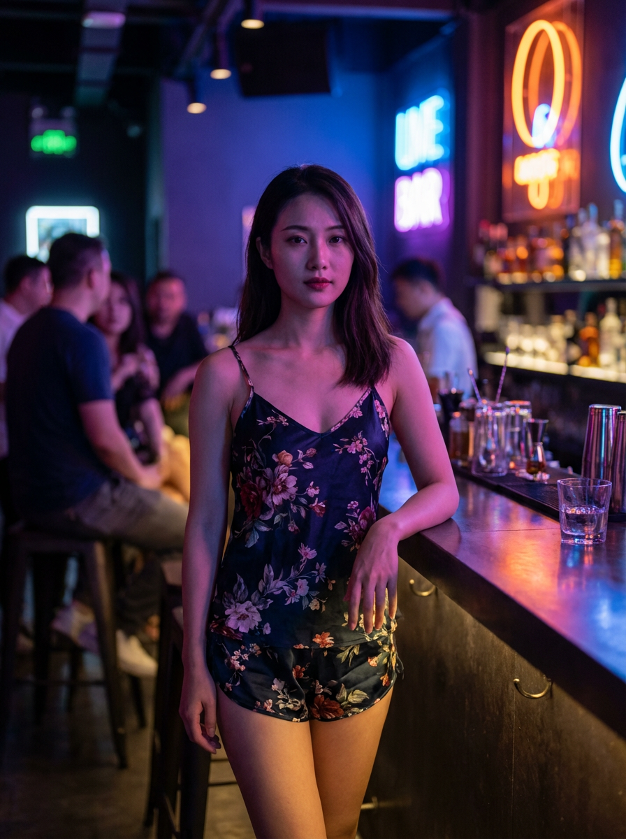 model with hourglass figure, in floral silk lingerie at cocktail bar with neon lights