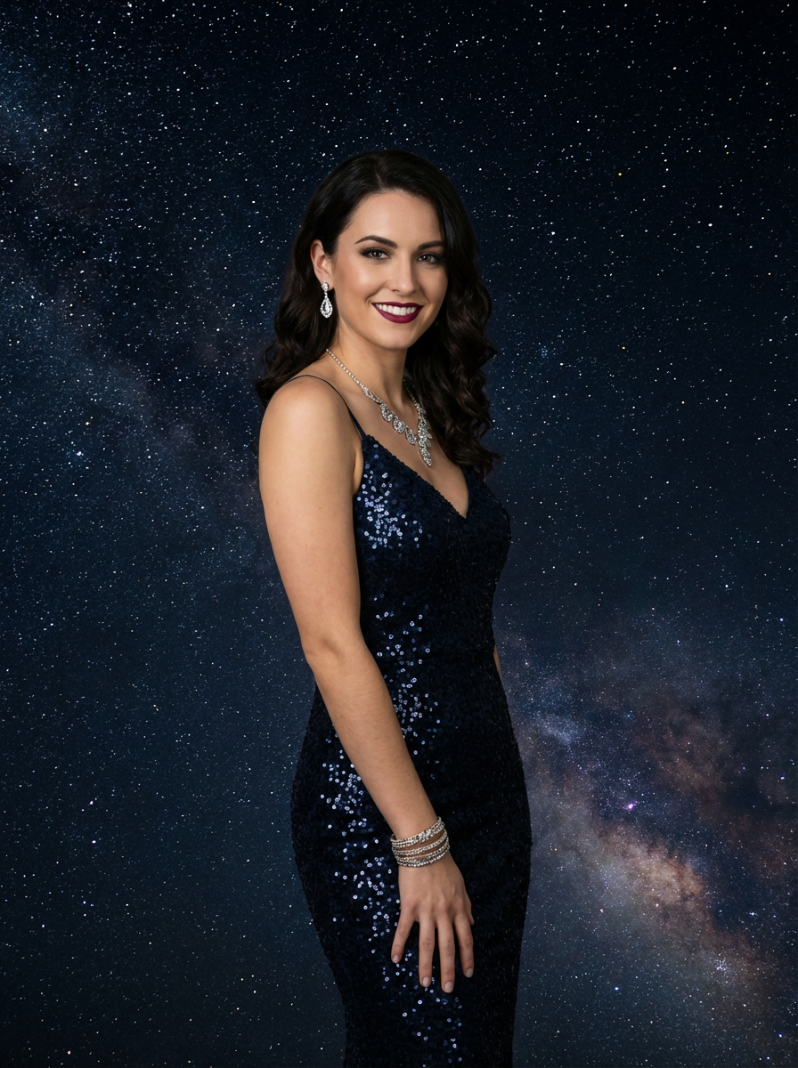 model with magnetic appeal, adorned in sparkling jewelry , against a starry night backdrop