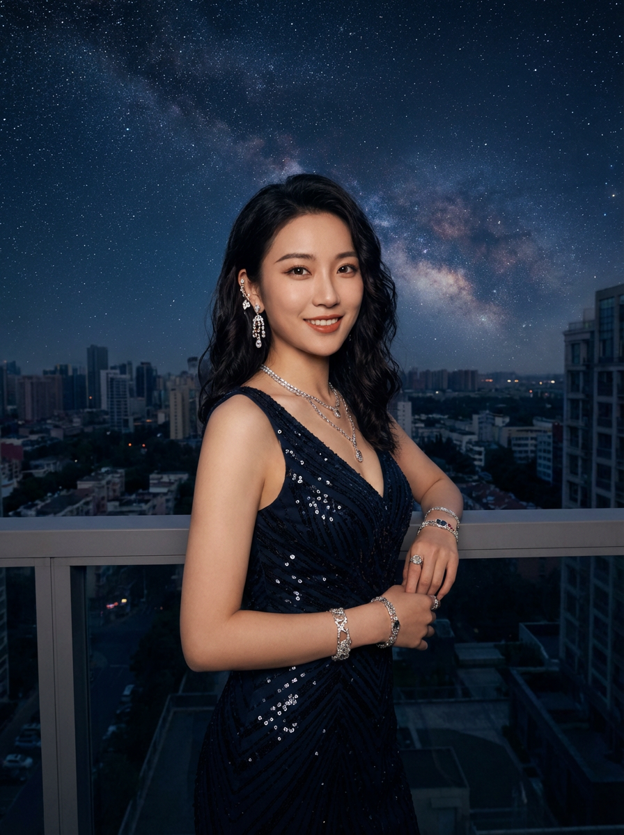 model with magnetic appeal, adorned in sparkling jewelry , against a starry night backdrop