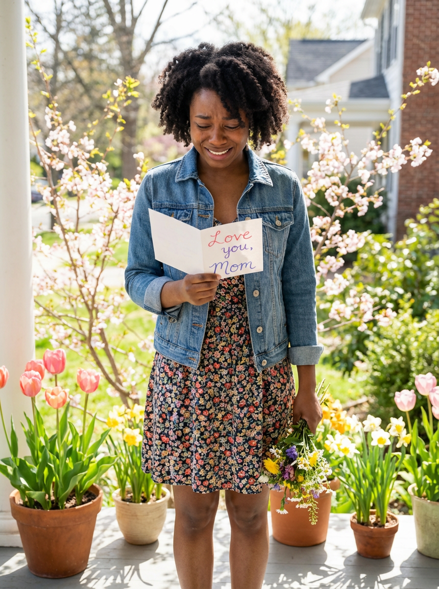 model with Mothers Day card, heartfelt moment, spring flowers visible, emotional connection