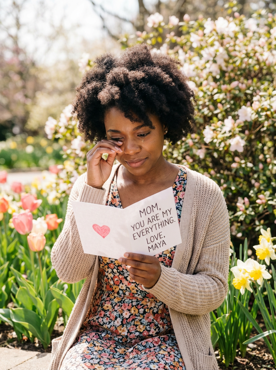 model with Mothers Day card, heartfelt moment, spring flowers visible, emotional connection