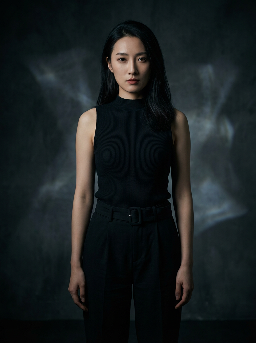 model with mysterious alluring expression, artistic portrait lighting, creative composition