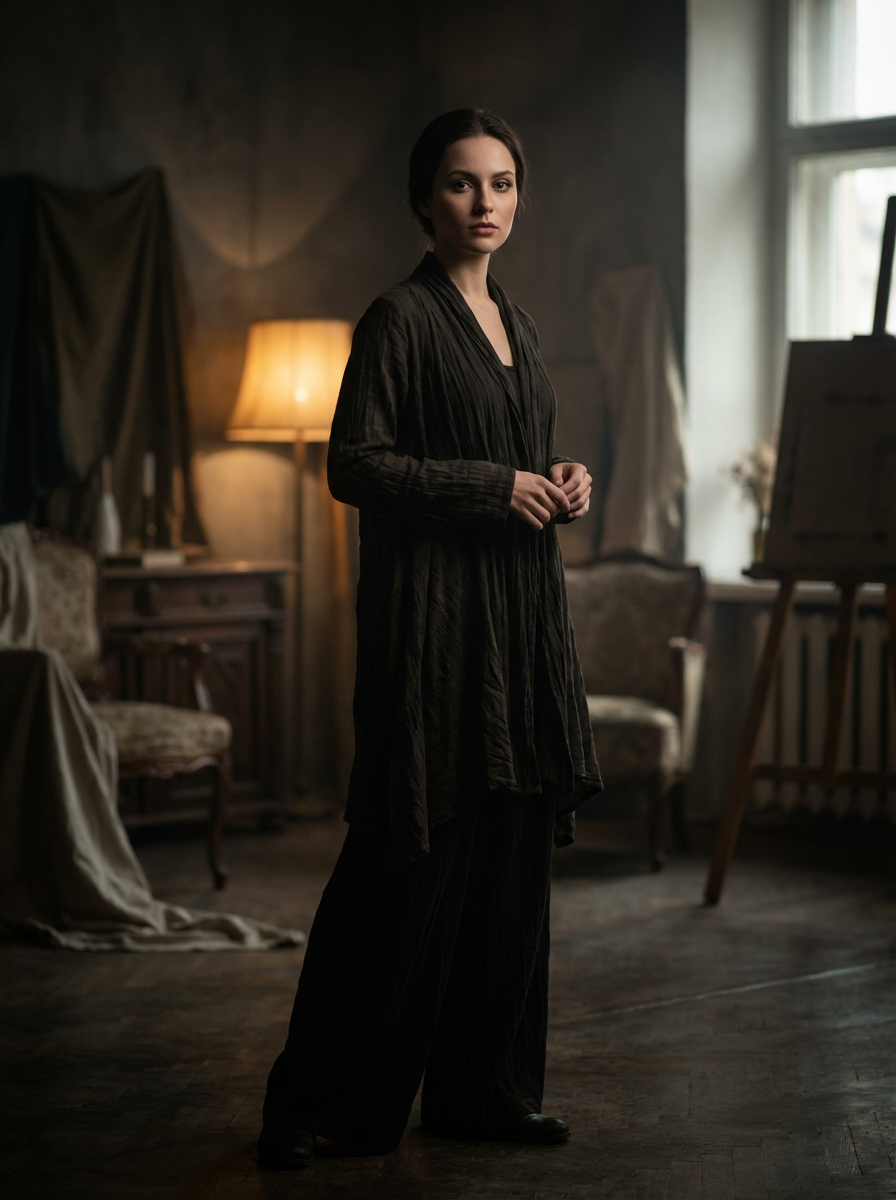 model with mysterious alluring expression, artistic portrait lighting, creative composition