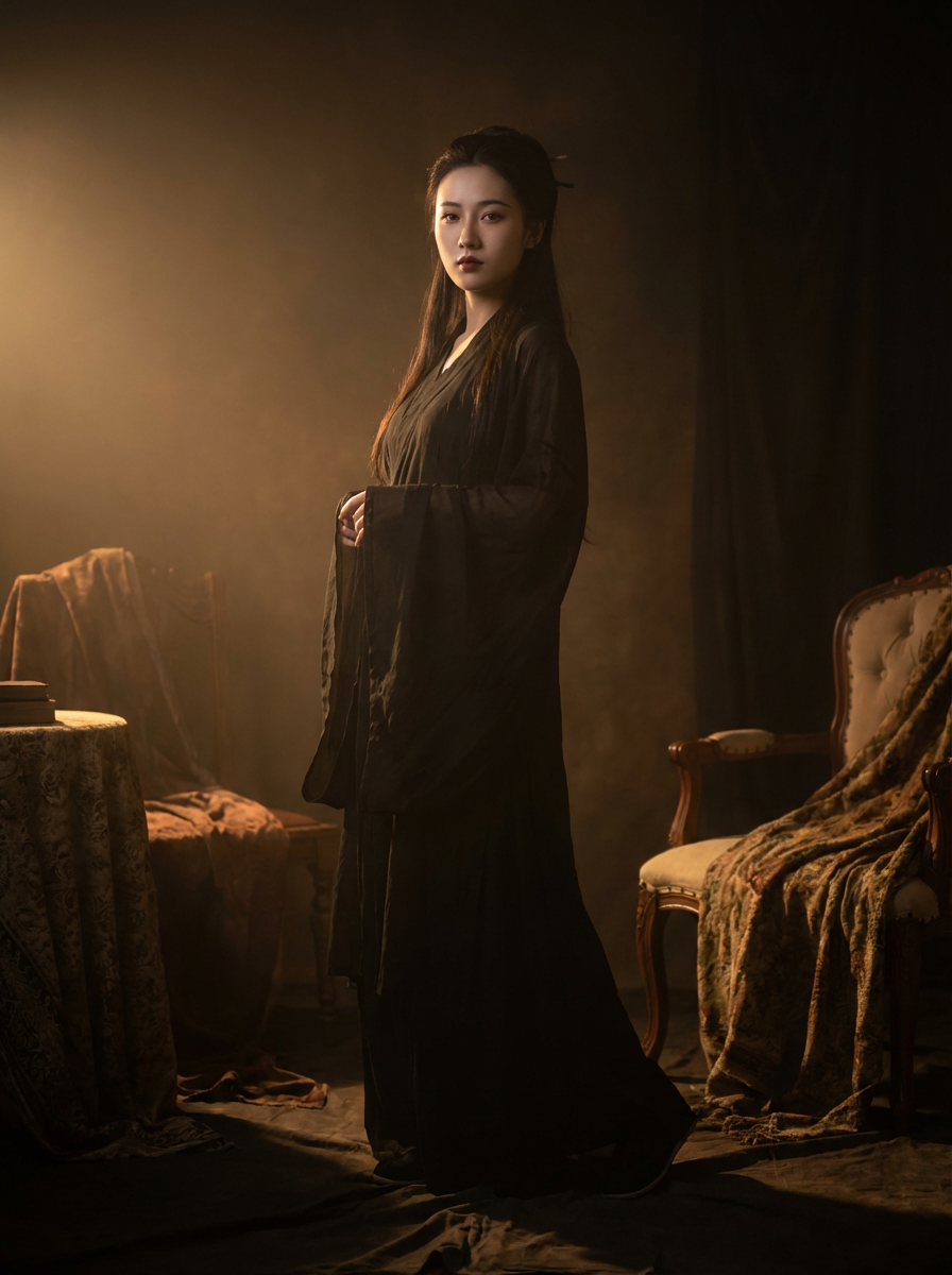 model with mysterious alluring expression, artistic portrait lighting, creative composition