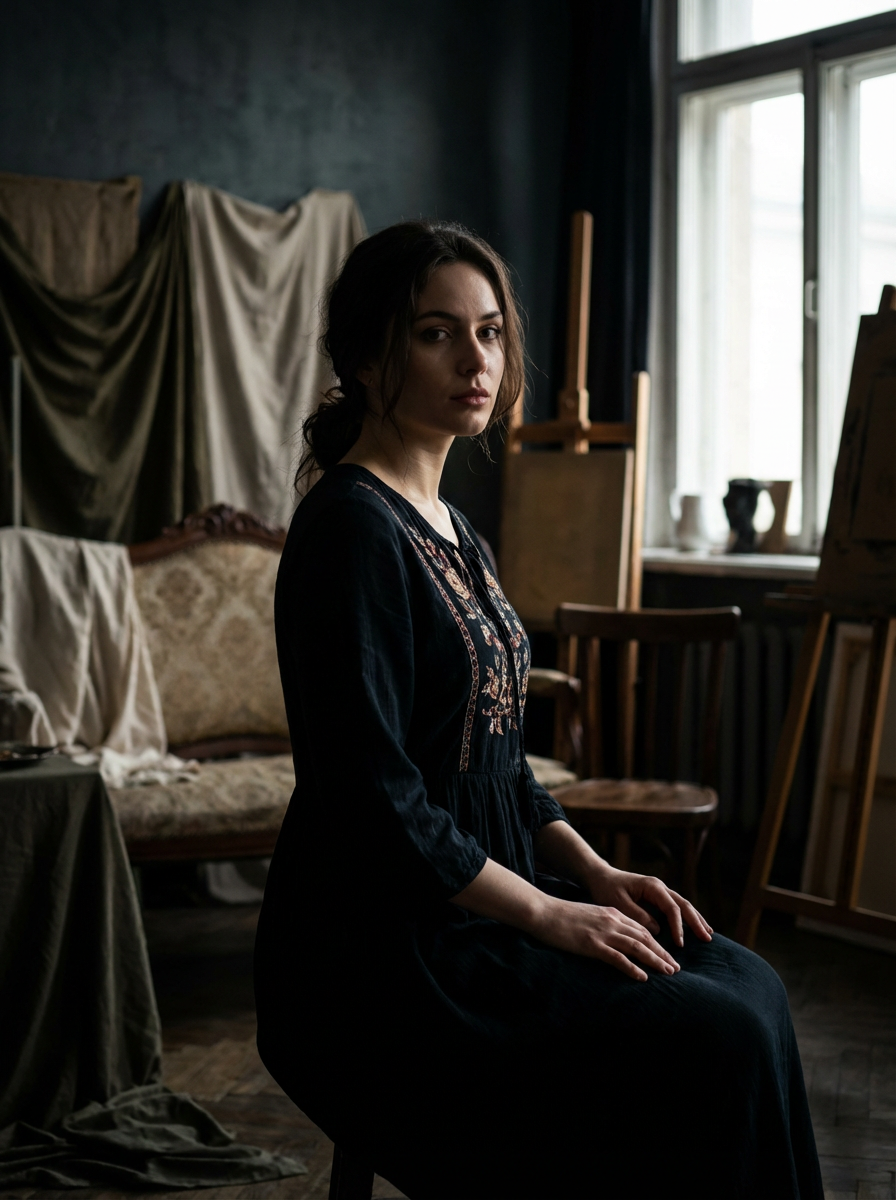 model with mysterious alluring expression, artistic portrait lighting, creative composition