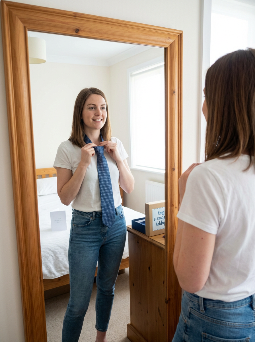 model with new tie gift, classic Fathers Day present, trying on tie, mirror or home setting