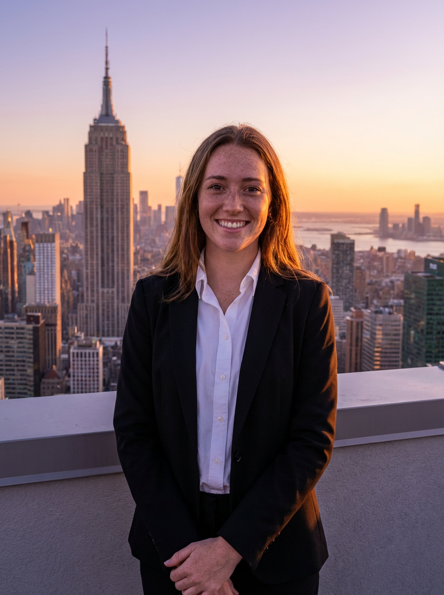 model with New York skyline view, rooftop setting, Empire State Building visible, chic outfit, sunset lighting