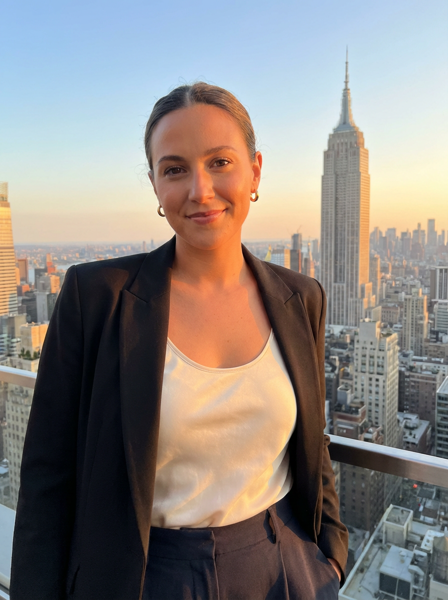 model with New York skyline view, rooftop setting, Empire State Building visible, chic outfit, sunset lighting
