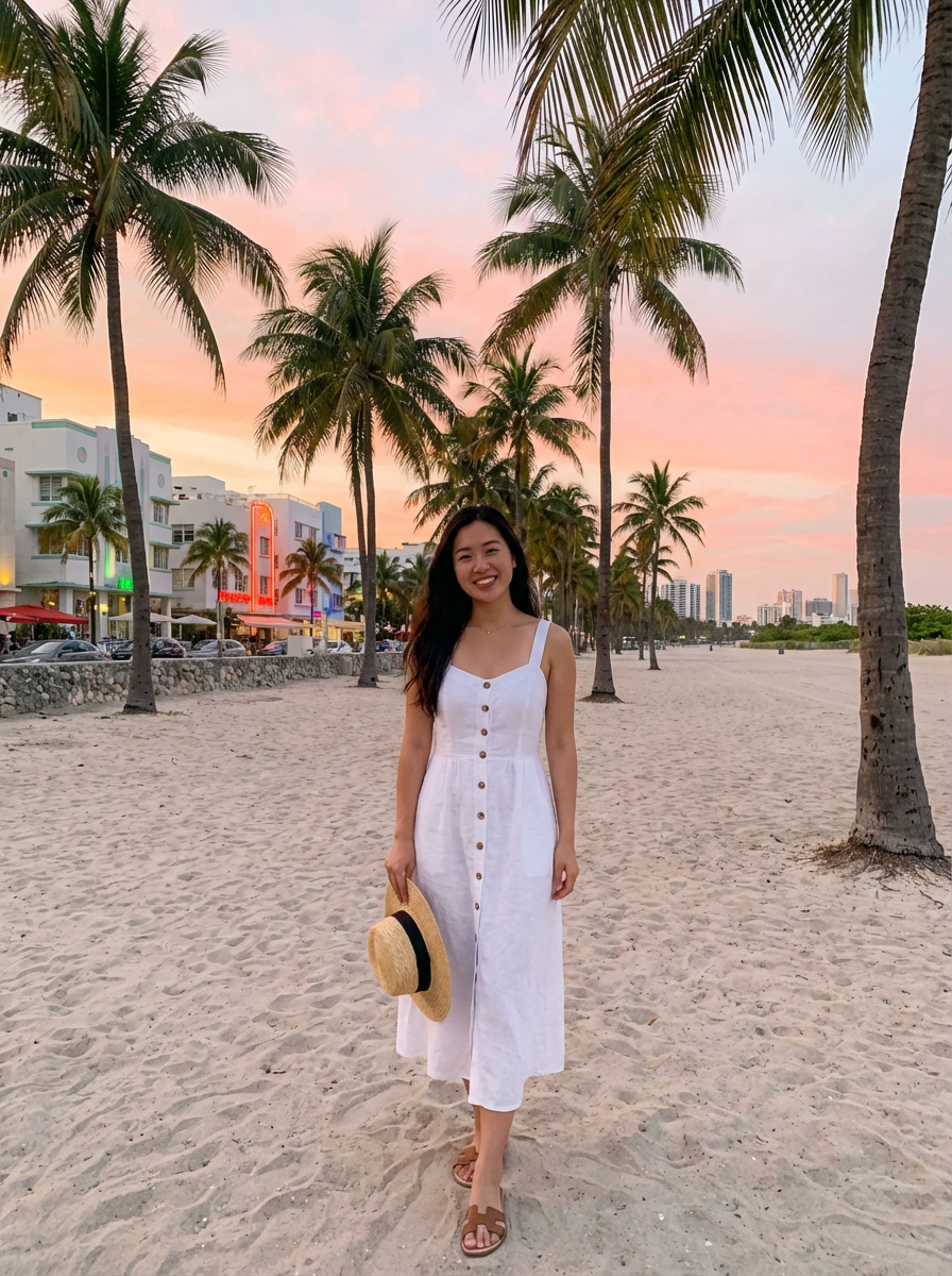 model with palm trees and pink sunset, quintessential Miami aesthetic, summer style
