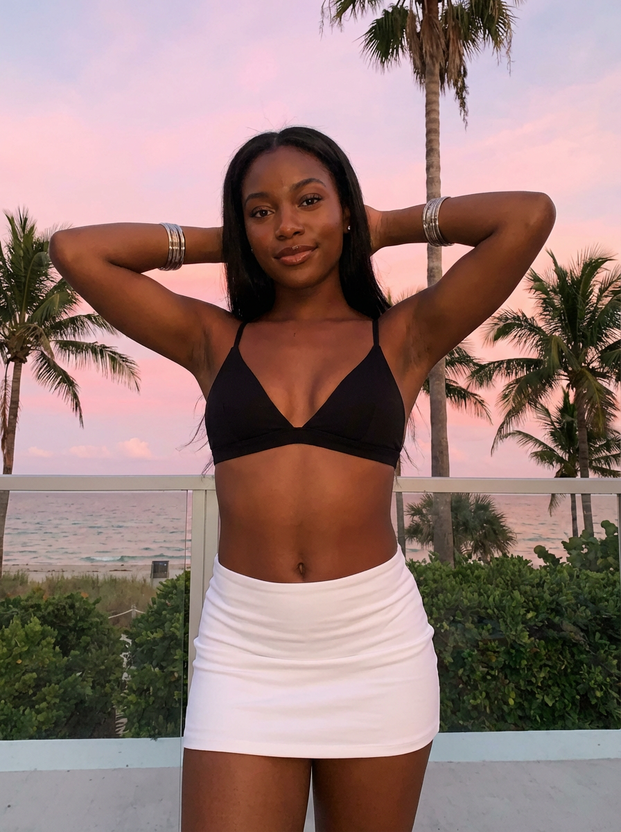 model with palm trees and pink sunset, quintessential Miami aesthetic, summer style
