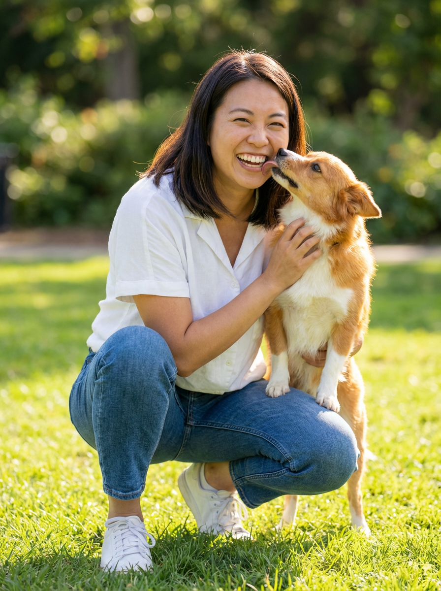 model with pet, animal lover vibes, genuine happy interaction, home or park setting