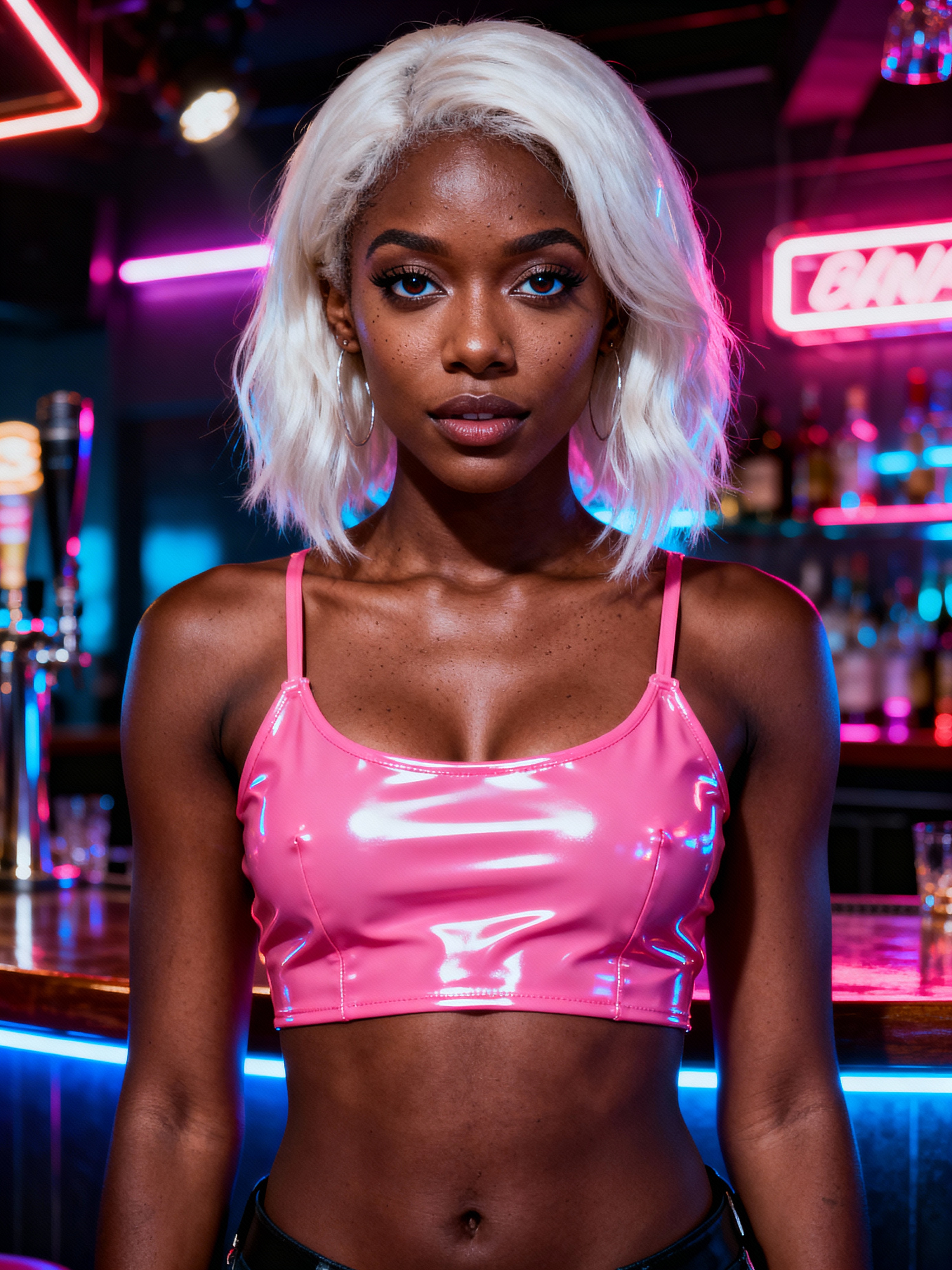 model with platinum blonde hair, in neon bar, cyberpunk, pink latex crop top, professional award winning photography, beautiful detailed eyes, highly detailed glossy eyes, high detailed skin, skin pores