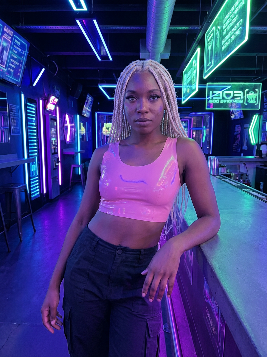 model with platinum blonde hair, in neon bar, cyberpunk, pink latex crop top, professional award winning photography, beautiful detailed eyes, highly detailed glossy eyes, high detailed skin, skin pores