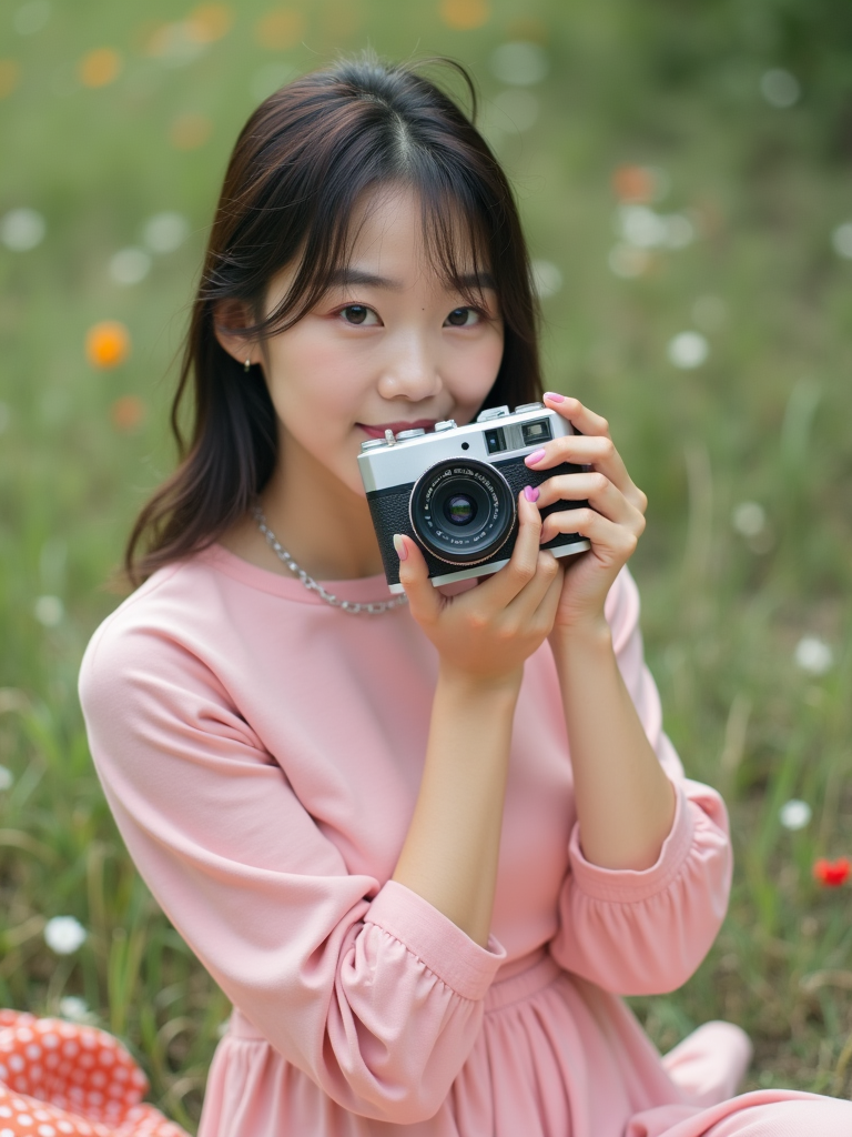 model with Polaroid camera in hand taking picnic photos, wearing a soft pink crop top and skirt set , candid vibe with playful birthday energy