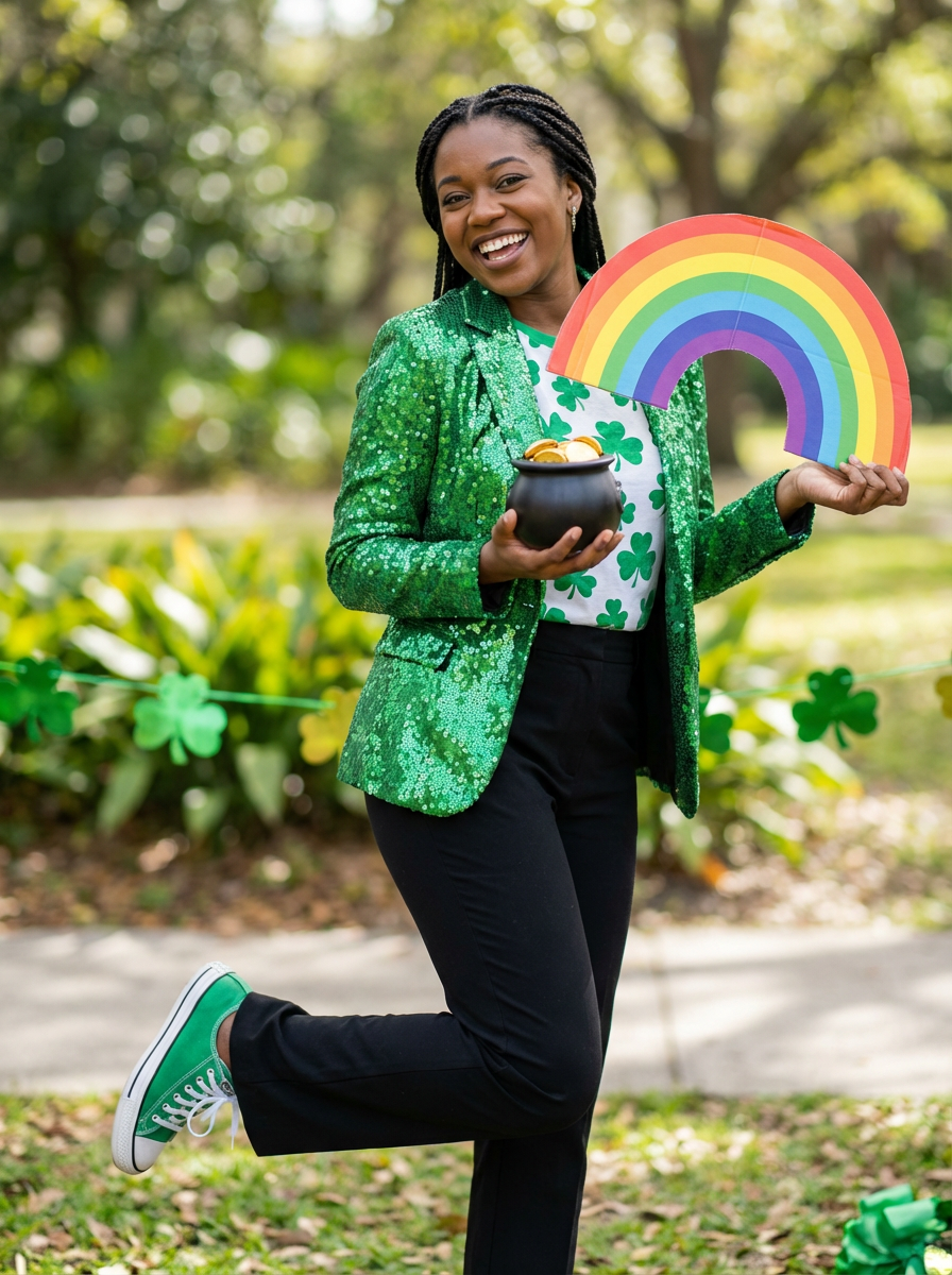 model with pot of gold and rainbow props, playful St Patricks Day theme, green outfit, fun expression