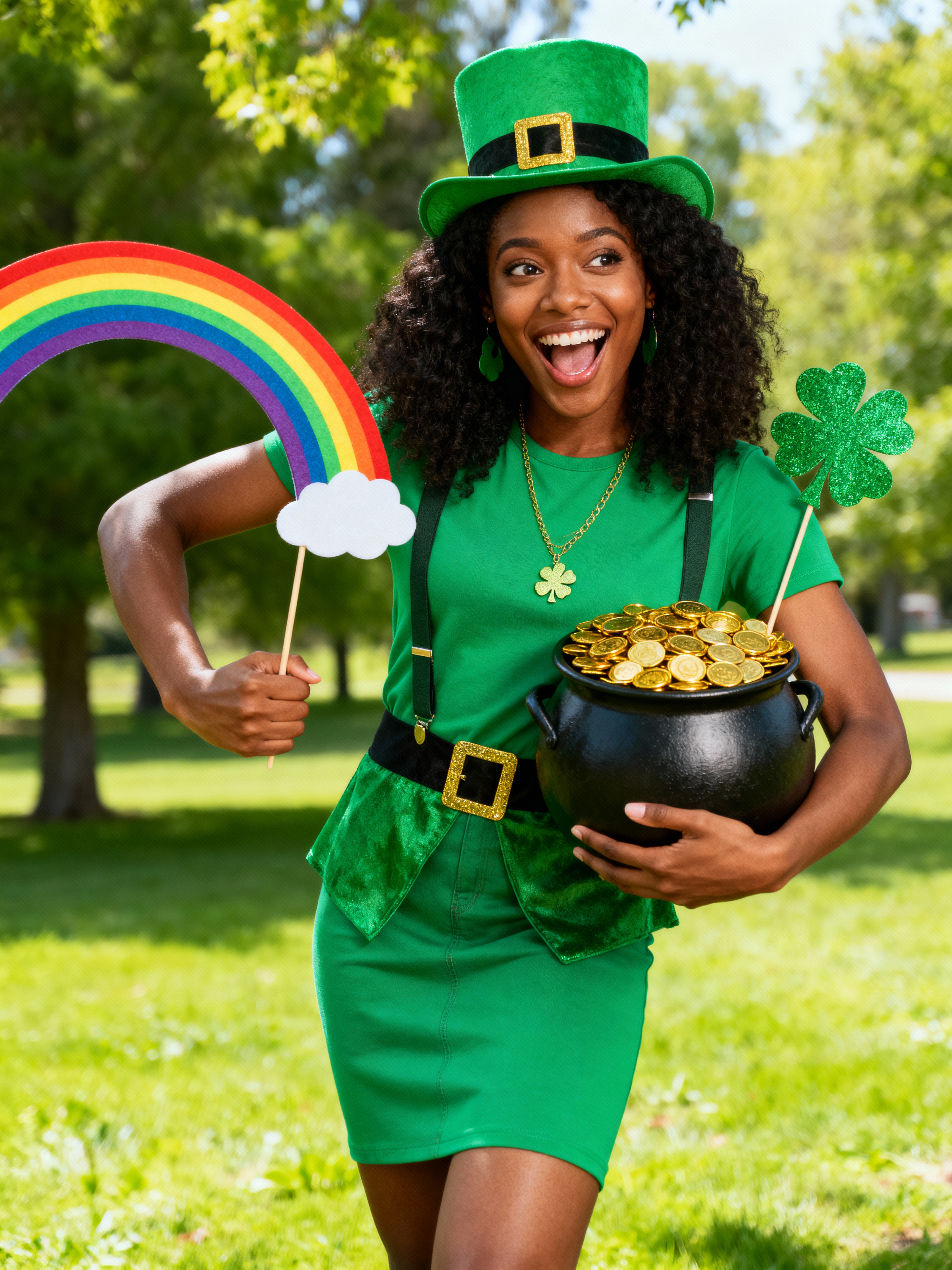 model with pot of gold and rainbow props, playful St Patricks Day theme, green outfit, fun expression