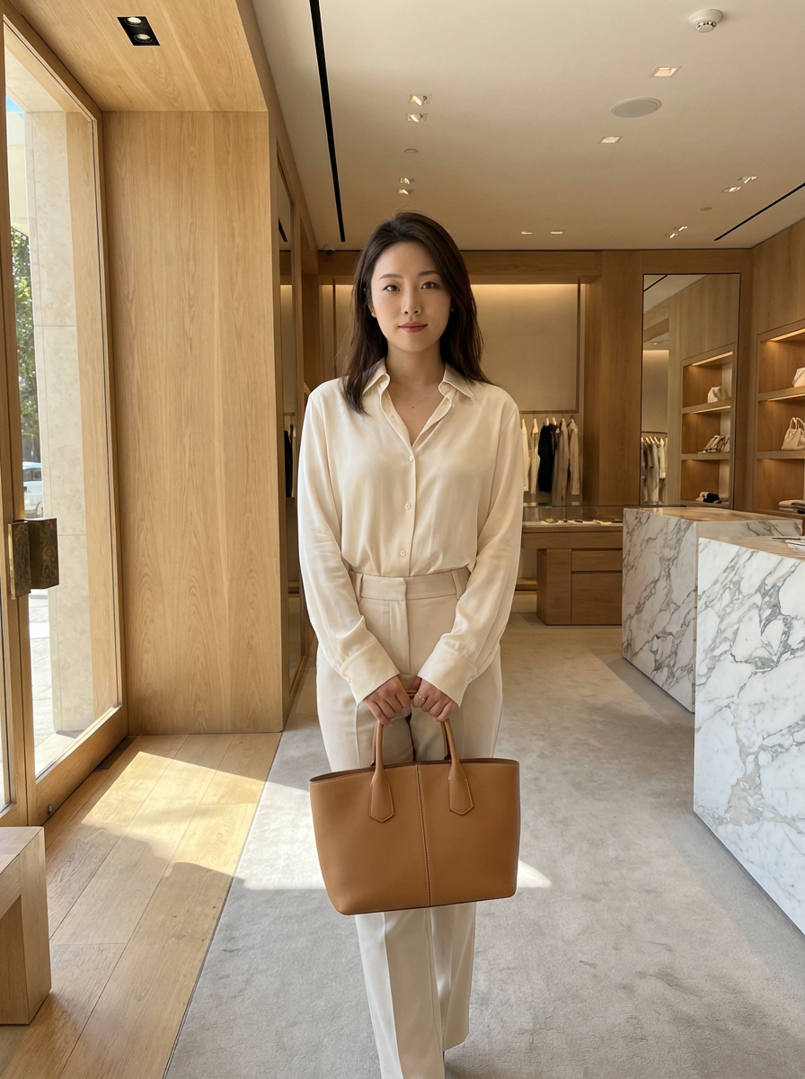 model with quiet luxury aesthetic, silk blouse, quality leather bag , neutral tones, upscale interior